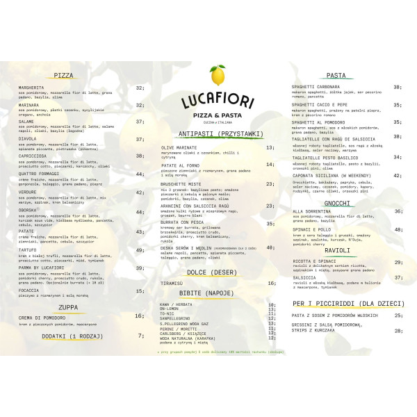 Menu obejmuje szeroki wybór pizz, przygotowywanych na tradycyjnym cieście z wysokiej jakości składników. Pizzeria Lucafiori to idealne miejsce dla miłośników włoskiej kuchni, którzy chcą wspierać inicjatywy społeczne. Zapraszamy do odwiedzin w Oborach lub do składania zamówień online.